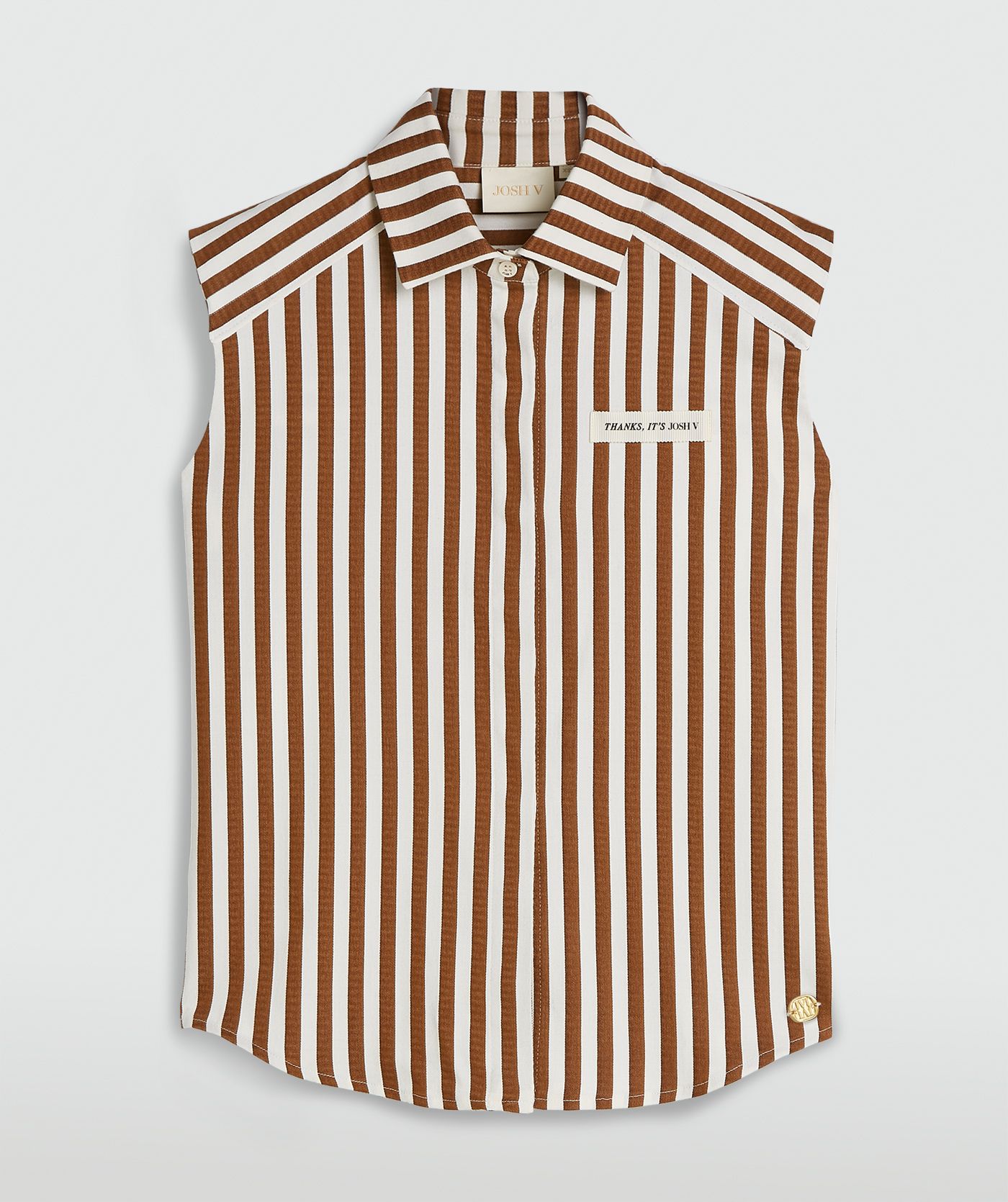 The JOSH V Suusa women's blouse in Mocha Brown Stripe is a straight fit sleeveless blouse with a striped pattern. The striped blouse is made from cotton sourced via the Better Cotton Initiative (BCI™), recycled polyester and elastane. The blouse fastens with buttons and features subtle shoulder pads.
