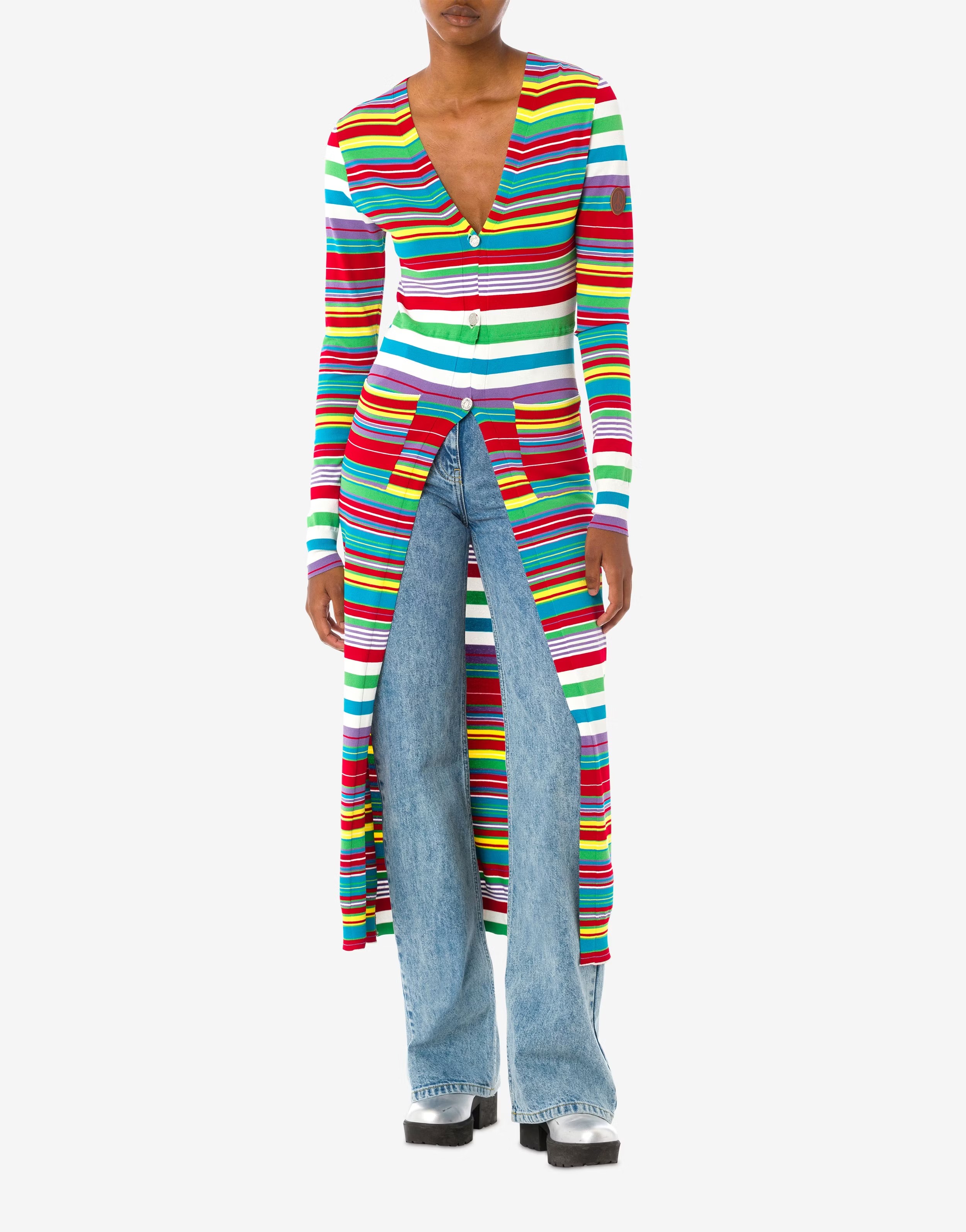 Stretch viscose long cardigan with multicolour stripe inlay and partial fastening on the front.Slim fit. V-neck. Long sleeves. Partial fastening with buttons.