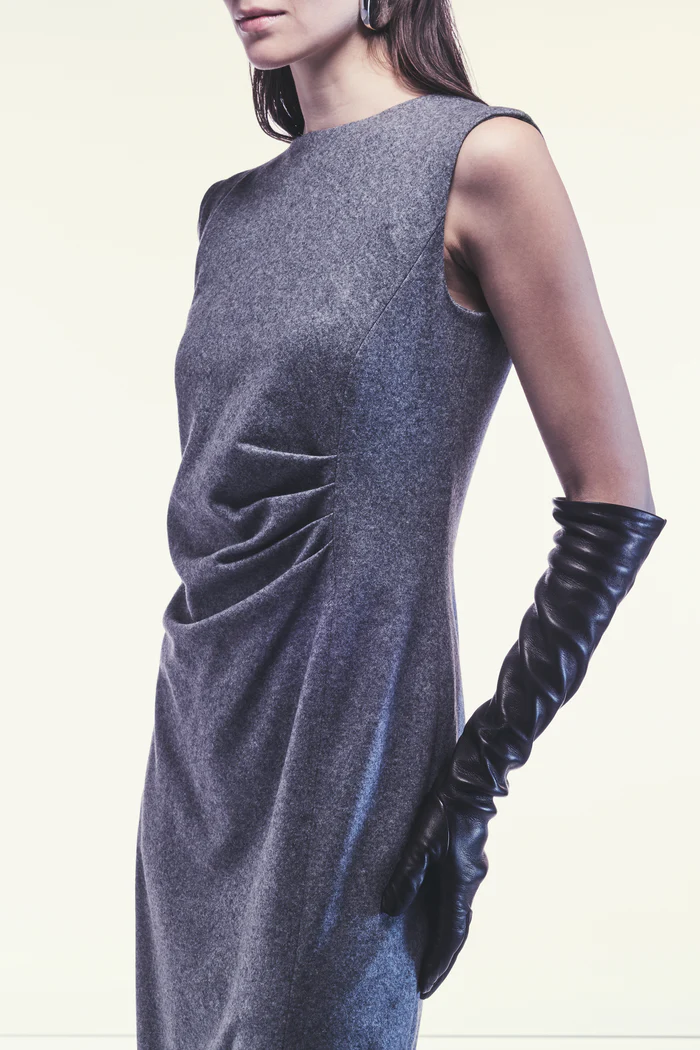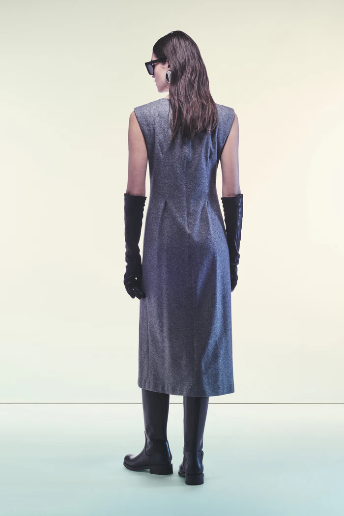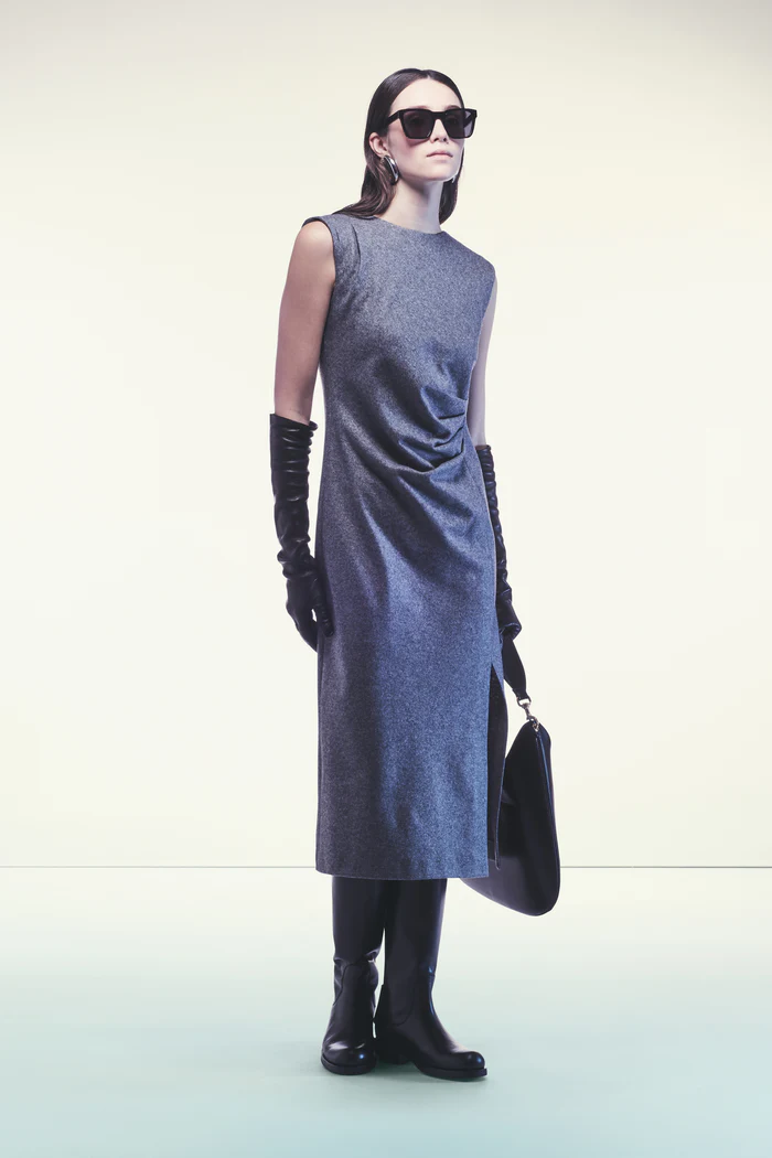 Draped midi dress in light grey cashmere cloth. fitted bust and slightly flared skirt. round neck, sleeveless, front drape and side slit. length below the knee.