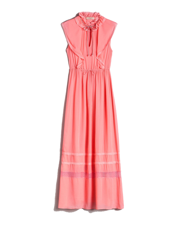 Georgette long dress with lace applications, drawstrings at the waist, corolla collar, matching slip.