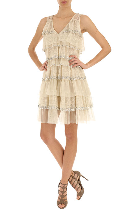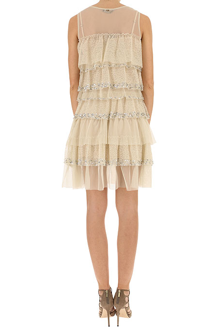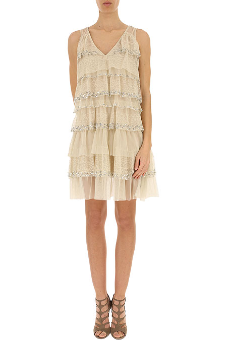 Tulle flounce dress with silver sequin embroidery, V-neck, wide straps, removable slip with thin straps.
