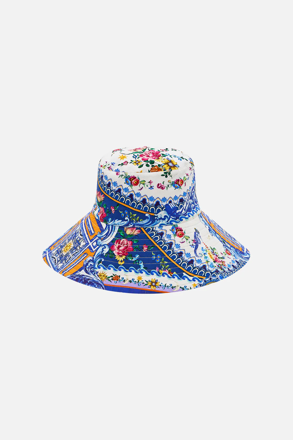 Designed in Australia, the Tiles Darls Wide Brim Bucket Hat reads the language of florals and tiles, blue and orange hues intertwine, a celebration of artisan hands and enduring beauty.