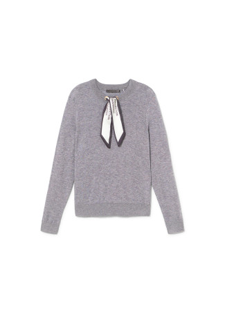 Soft knit sweater with elegant neck scarf. Versatile design with long sleeves and button closure at the back.