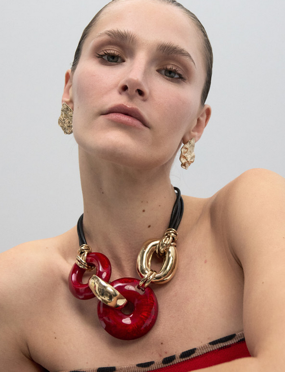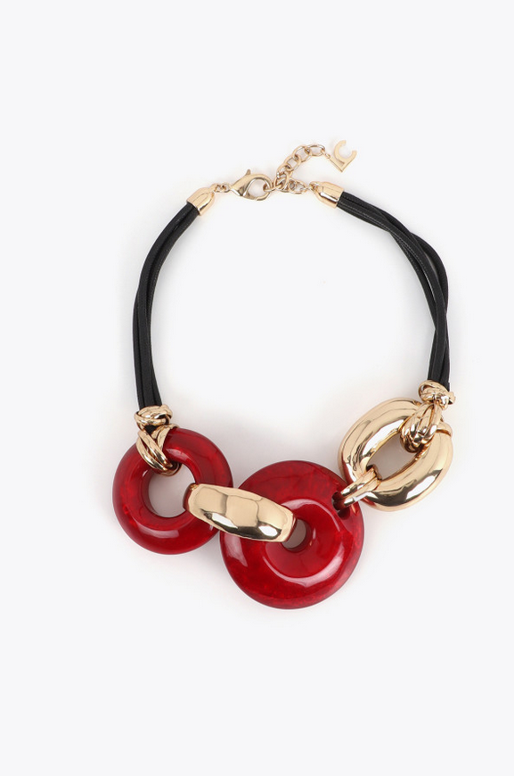 Dazzle with this short acrylic disc necklace in vibrant red. Complemented by gold details and an adjustable black cord. An accessory for a bold touch to any look, ideal for special evenings.