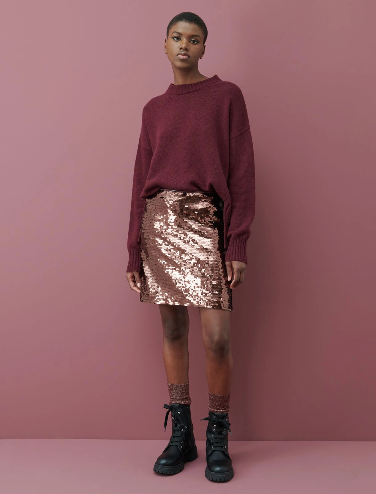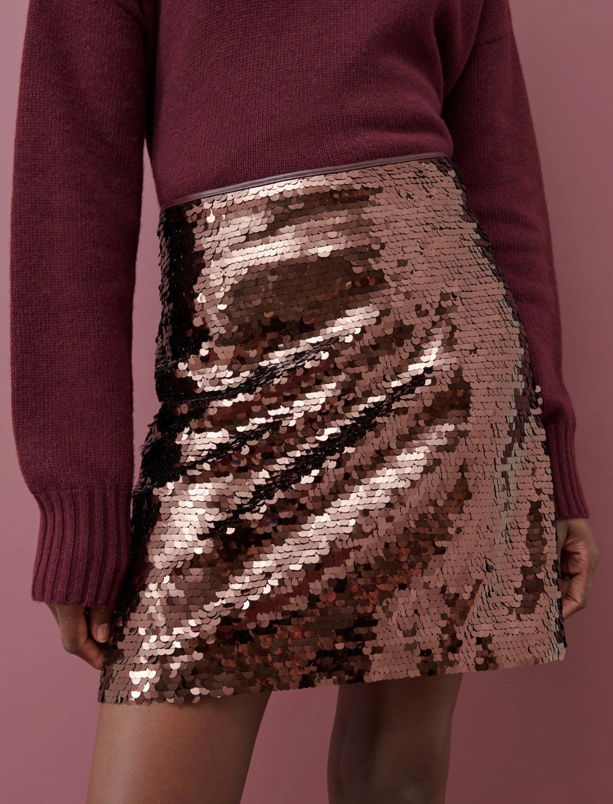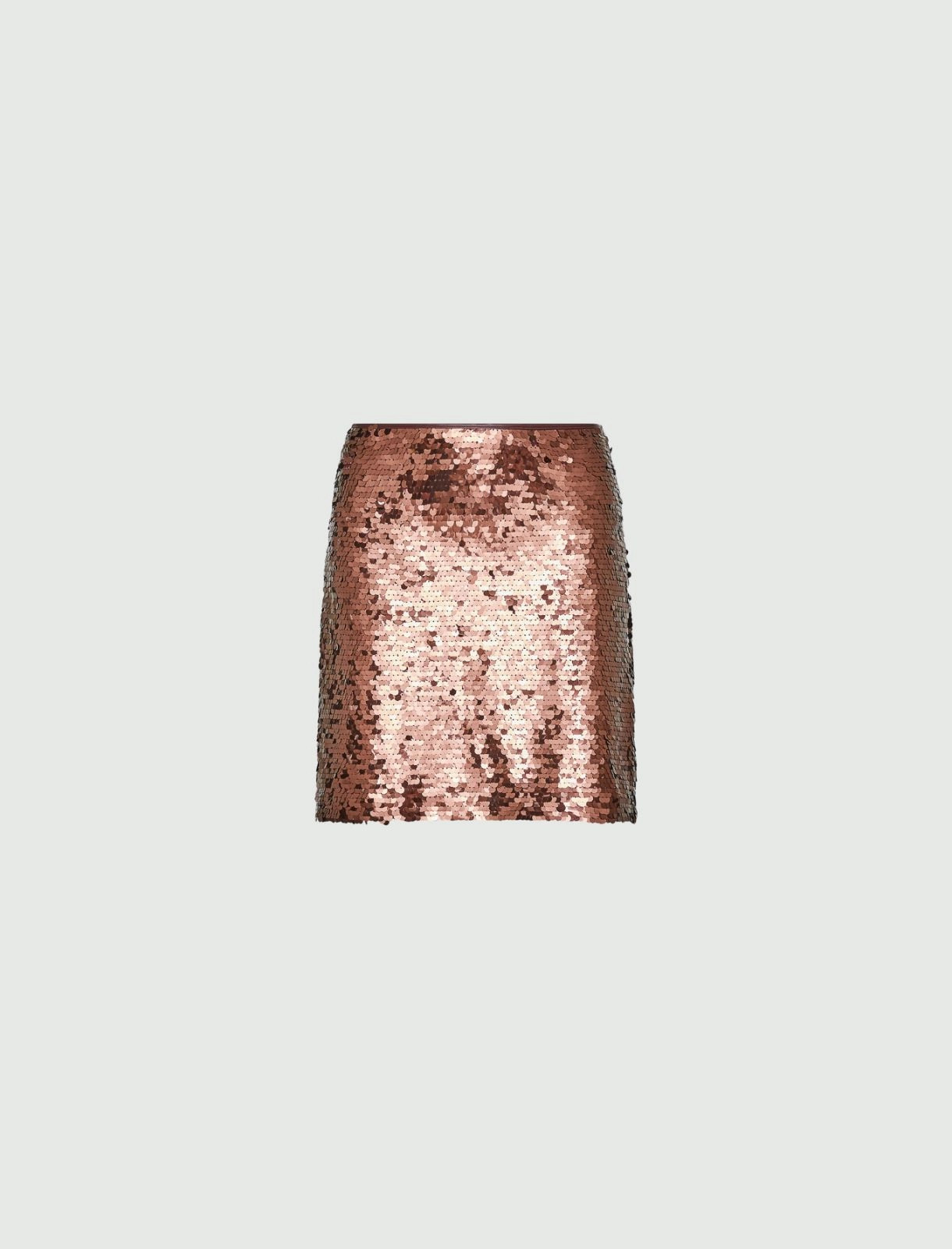 Short, straight fit sequinned tulle skirt featuring synthetic material piping. Concealed zip fastening at the side. Georgette lining. The fabric contains reclaimed polyester or polyamide fibres obtained from recycled plastic material.