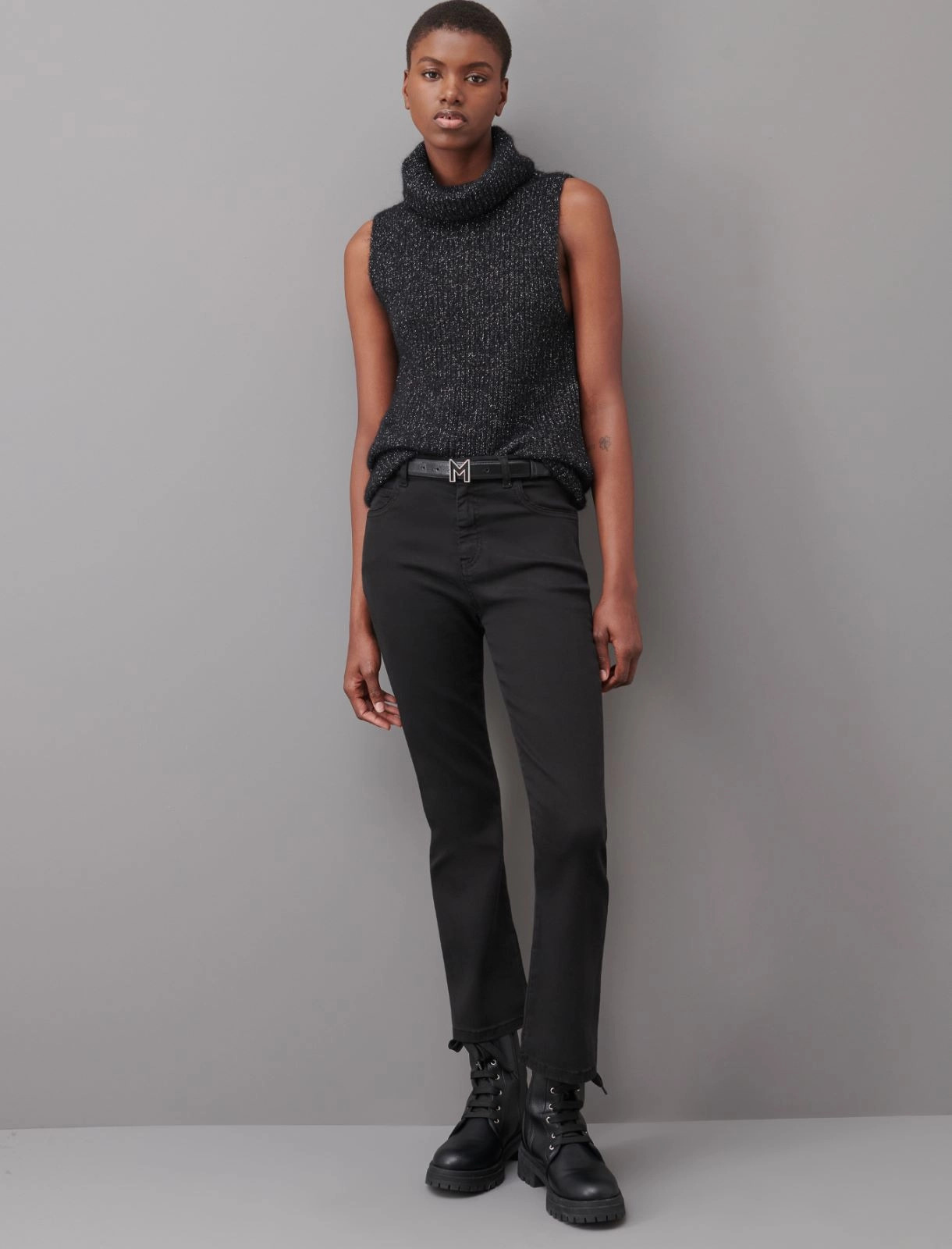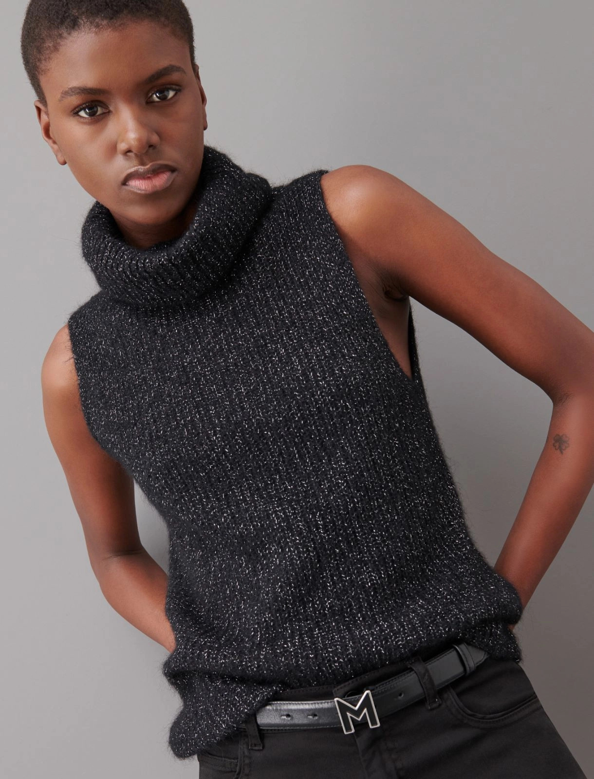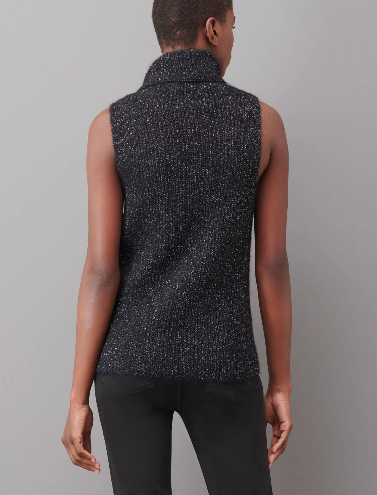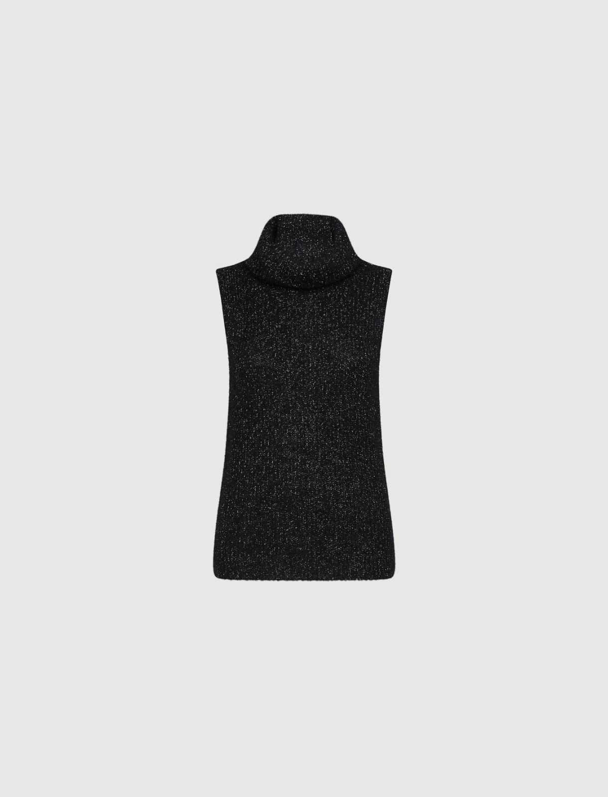 Semi fitted gilet in an alpaca blend cob knit with lurex. Sleeveless loose neck model.