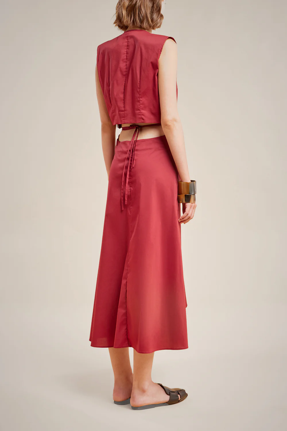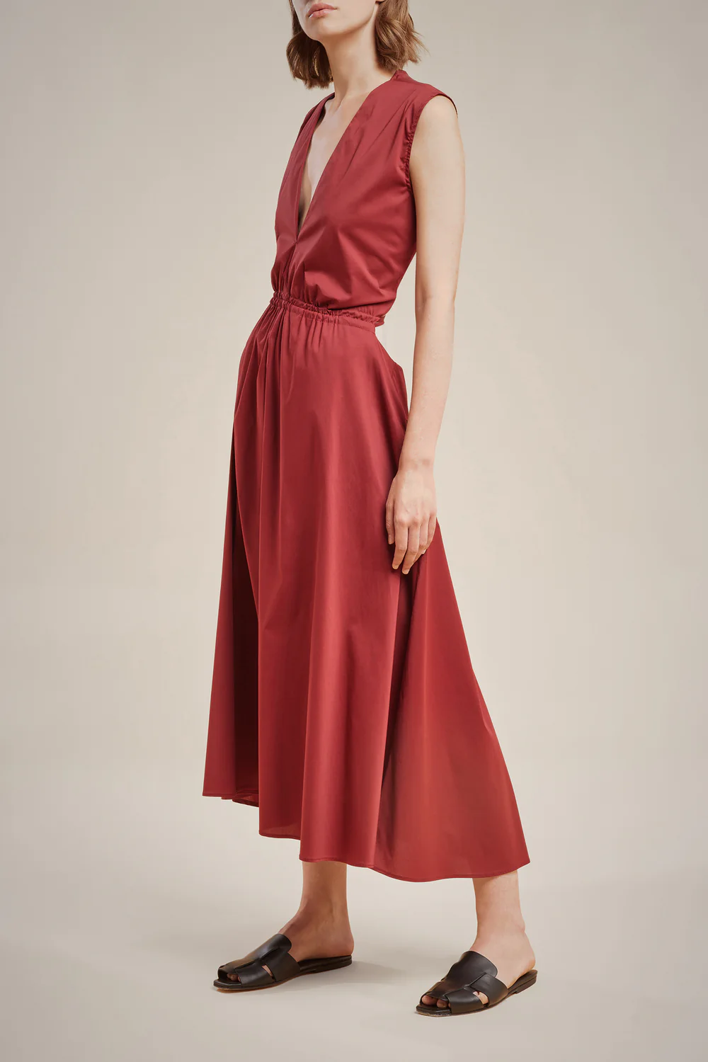 Stretch poplin dress, V-neck, armholes, marked waistline with gathering, cut-out detail on the sides, long flared skirt at the bottom.