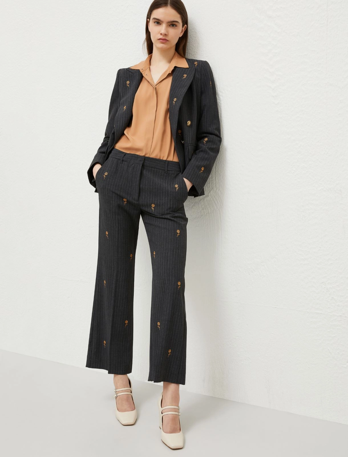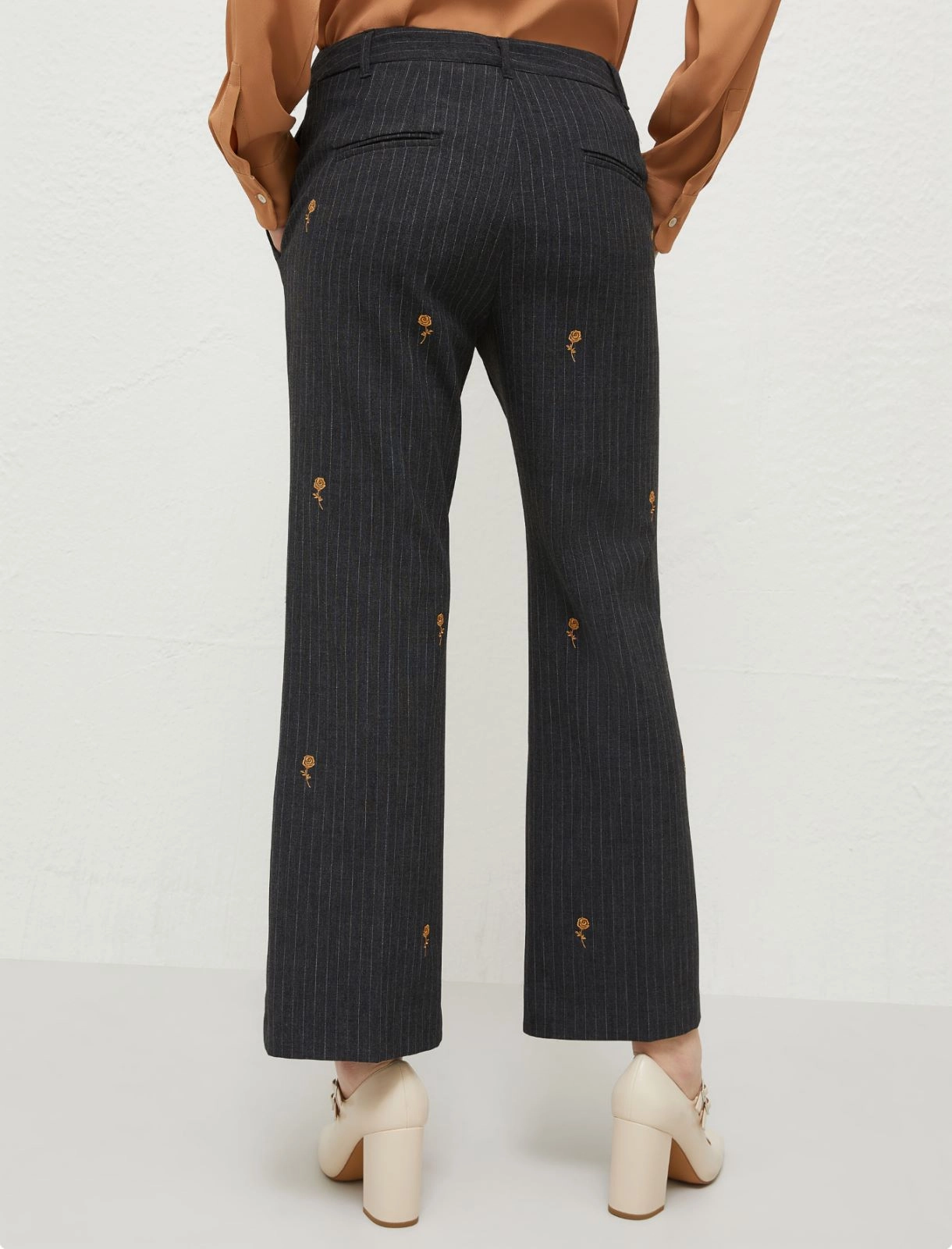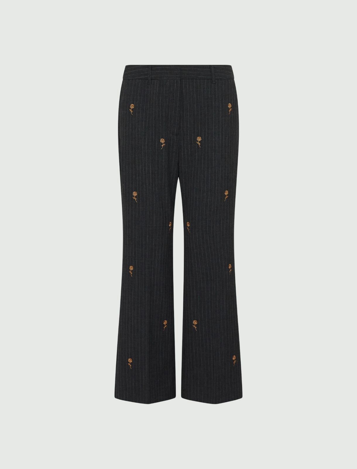 Pinstripe stretch canvas trousers.Flared fit with embroidered detail.Fly-covered hook-and-bar and zip fastening.Slant side pockets and welt rear pockets .Pressed pleat detail on the front and back.