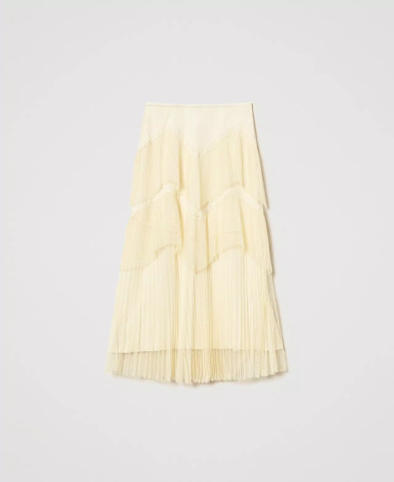 Long skirt made from point d'esprit tulle with pleated flounces and lace inserts. Satin waist and side zip fastening, lining, A-line style.