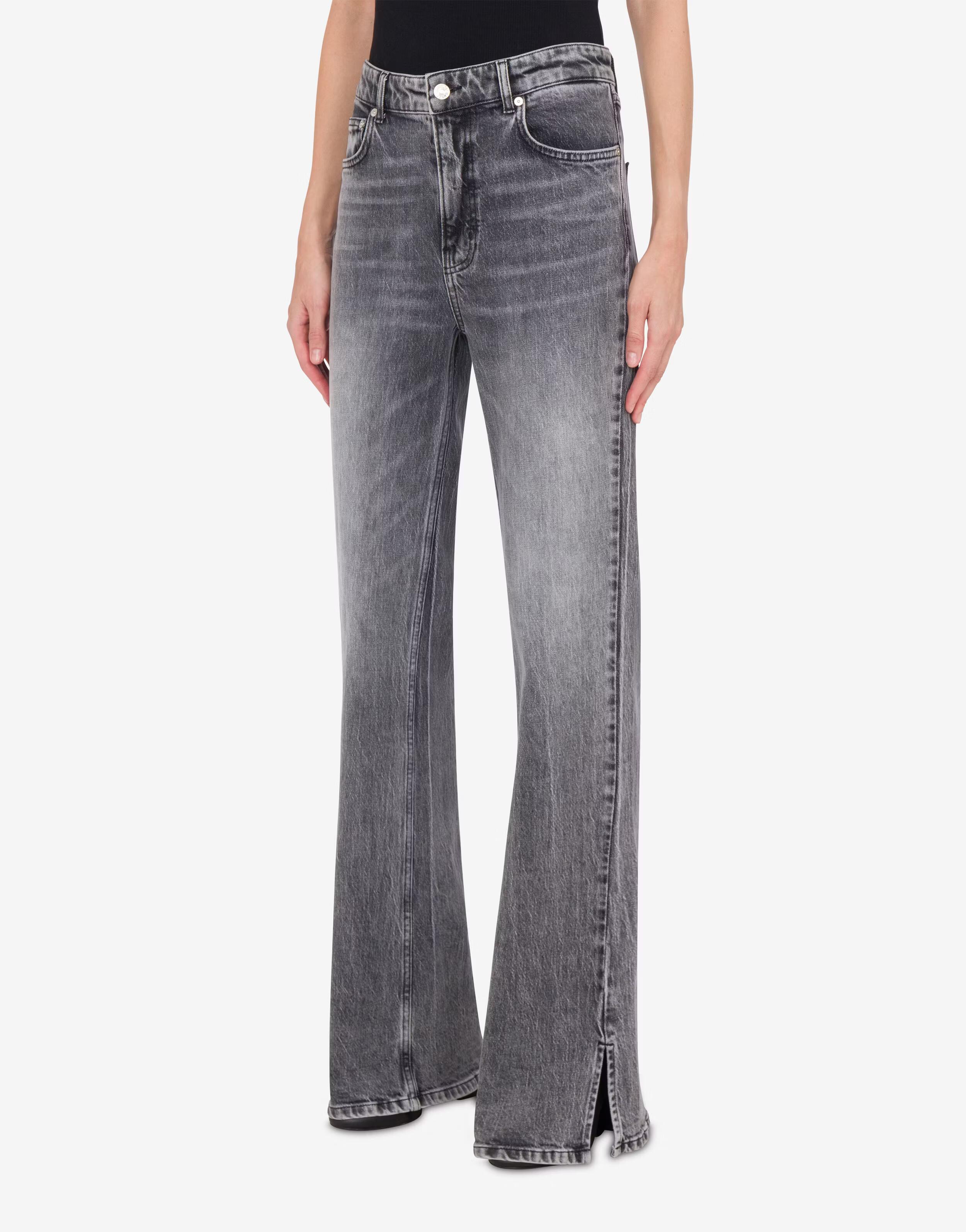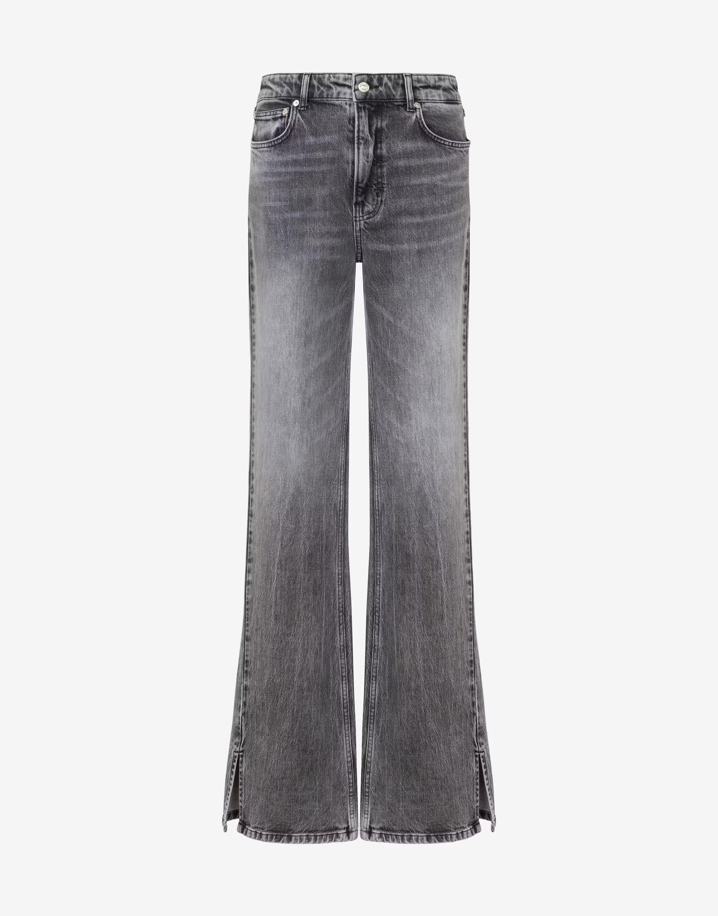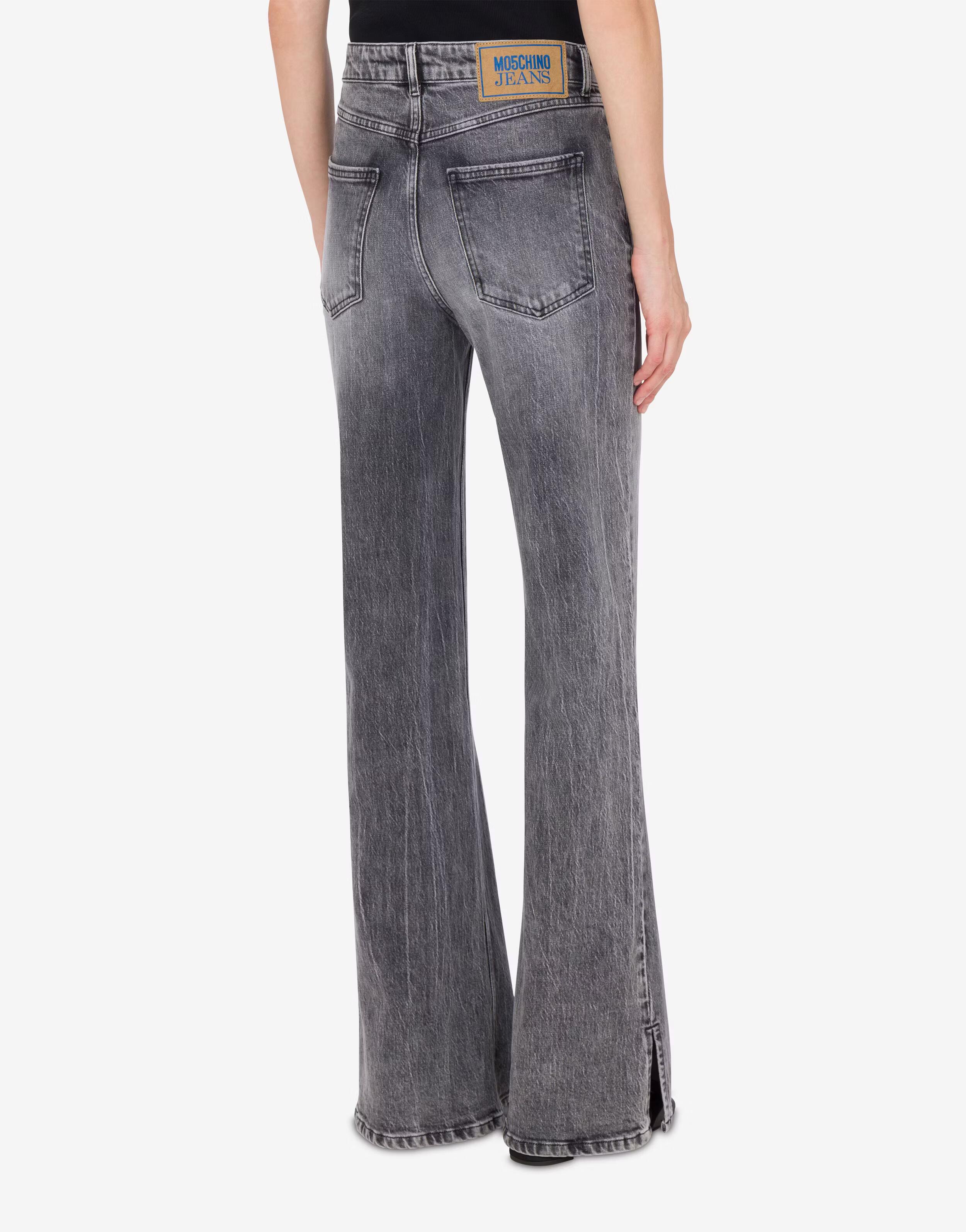 Flare five-pocket stretch cotton denim pants with logo patch applied on the back pocket.