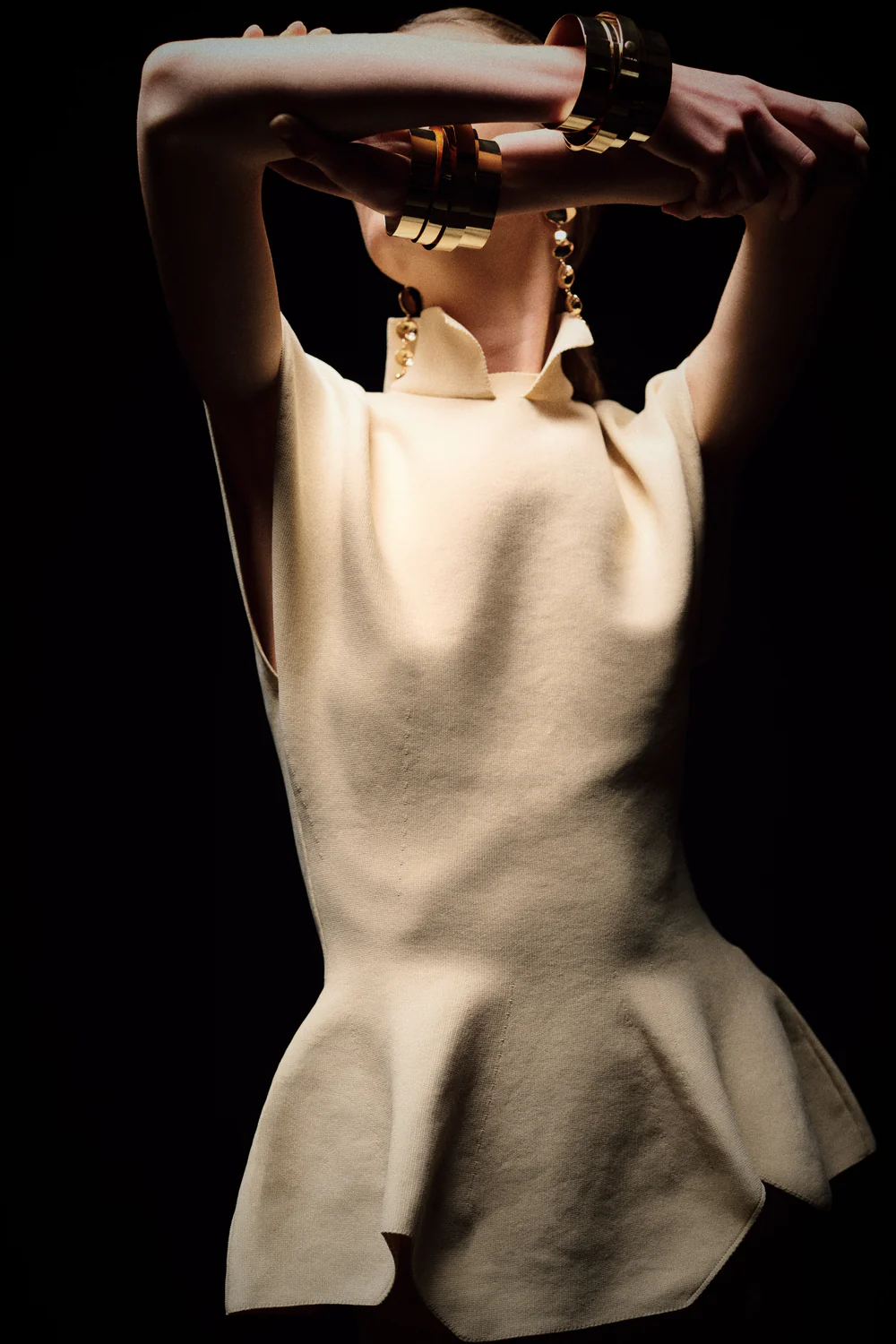 Technical nylon knit with butterfly sleeves, high open neckline, rouches at the bottom. Sculpted fit.