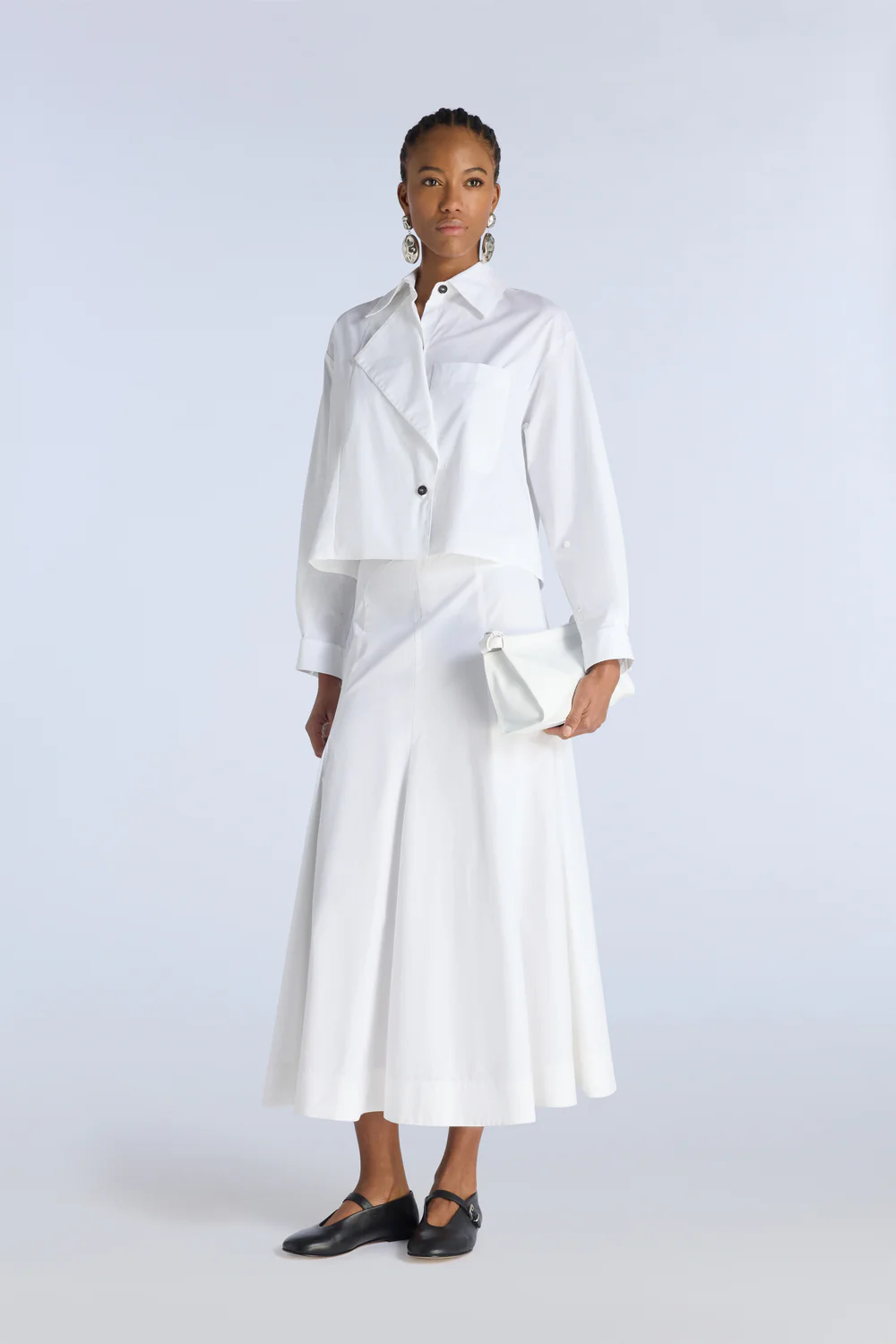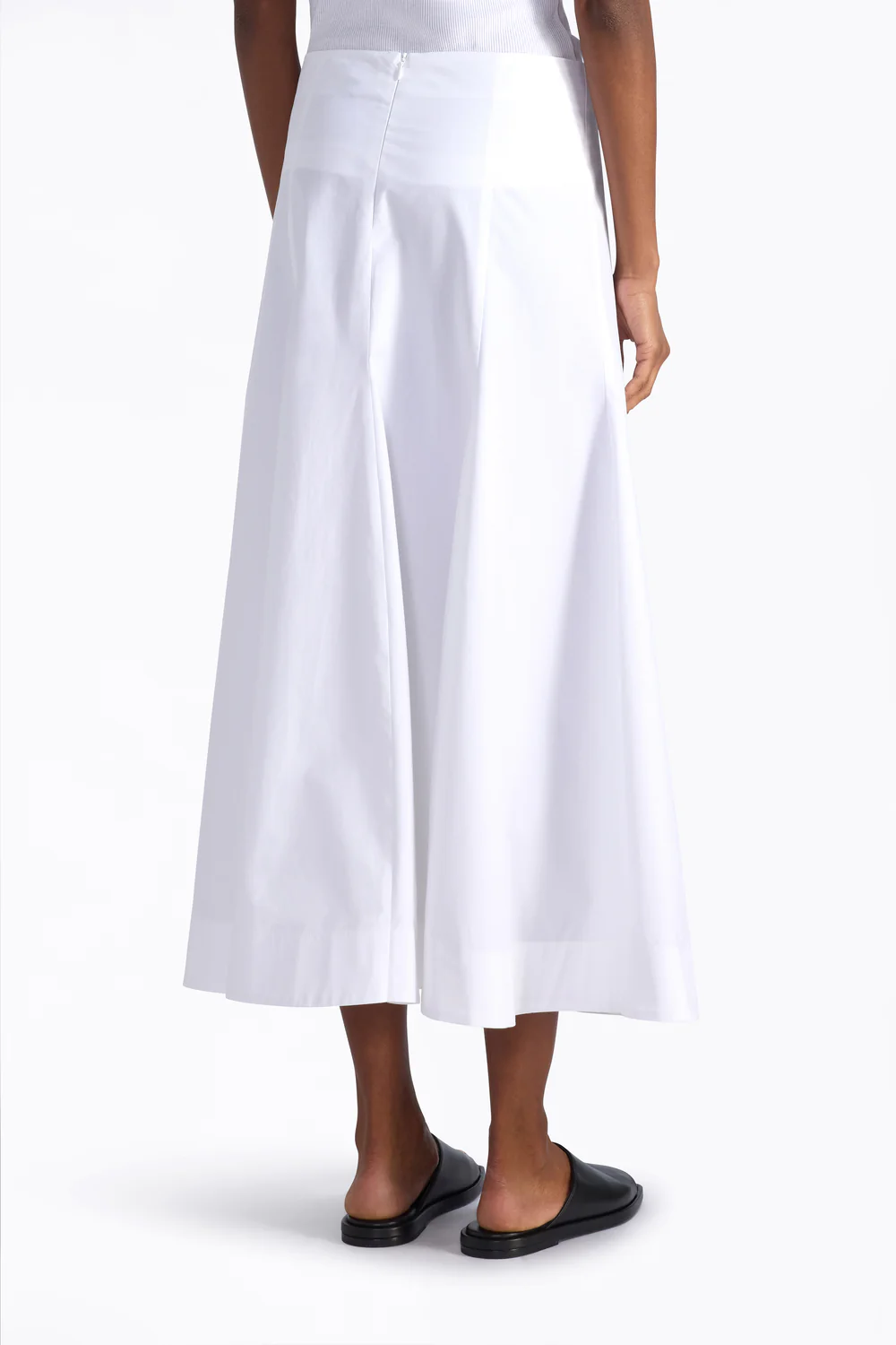 Midi skirt in lightweight poplin. central pleat creating a drapped effect. Hidden waistband with zip closure at the back. Straight line widthening to an a-line.