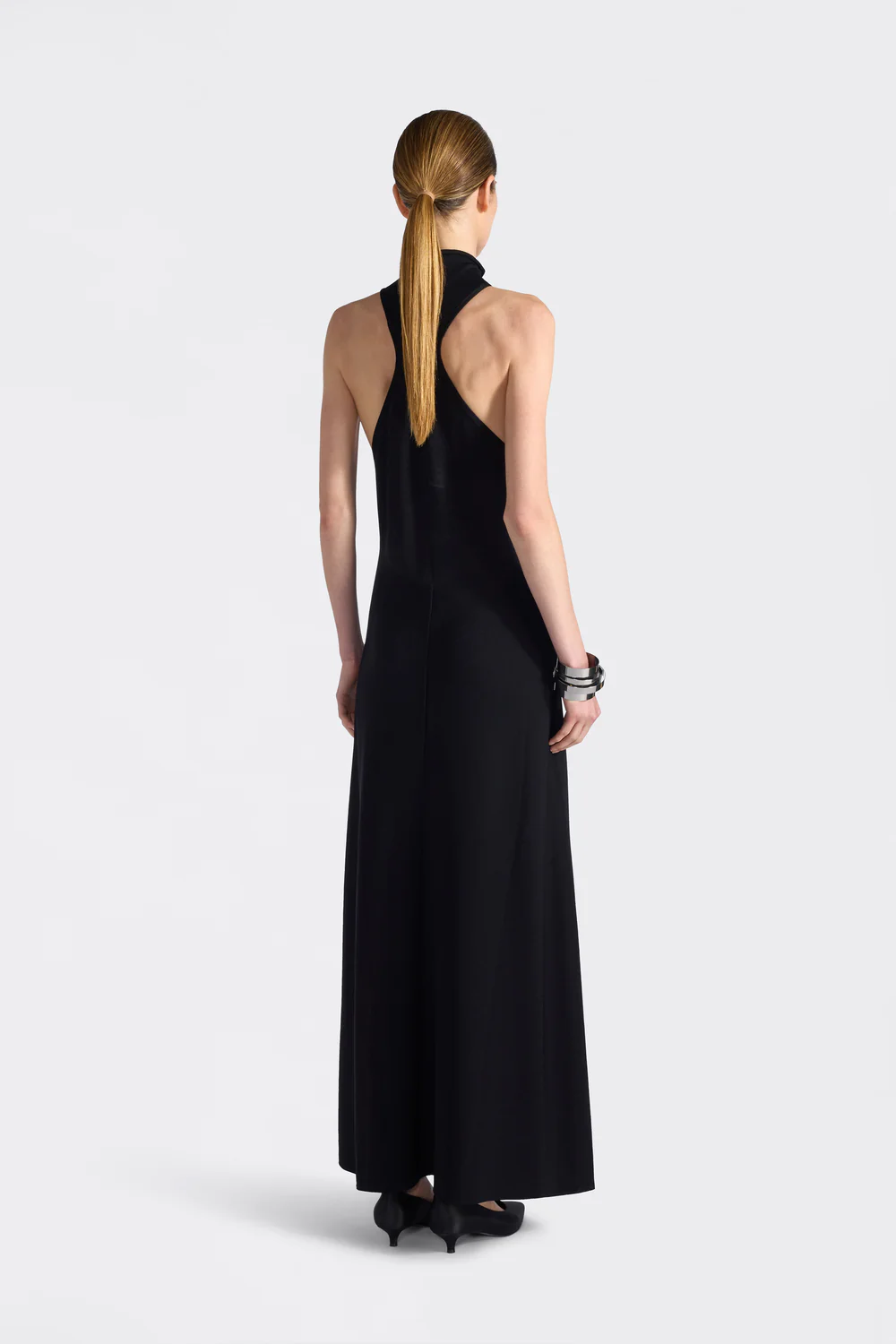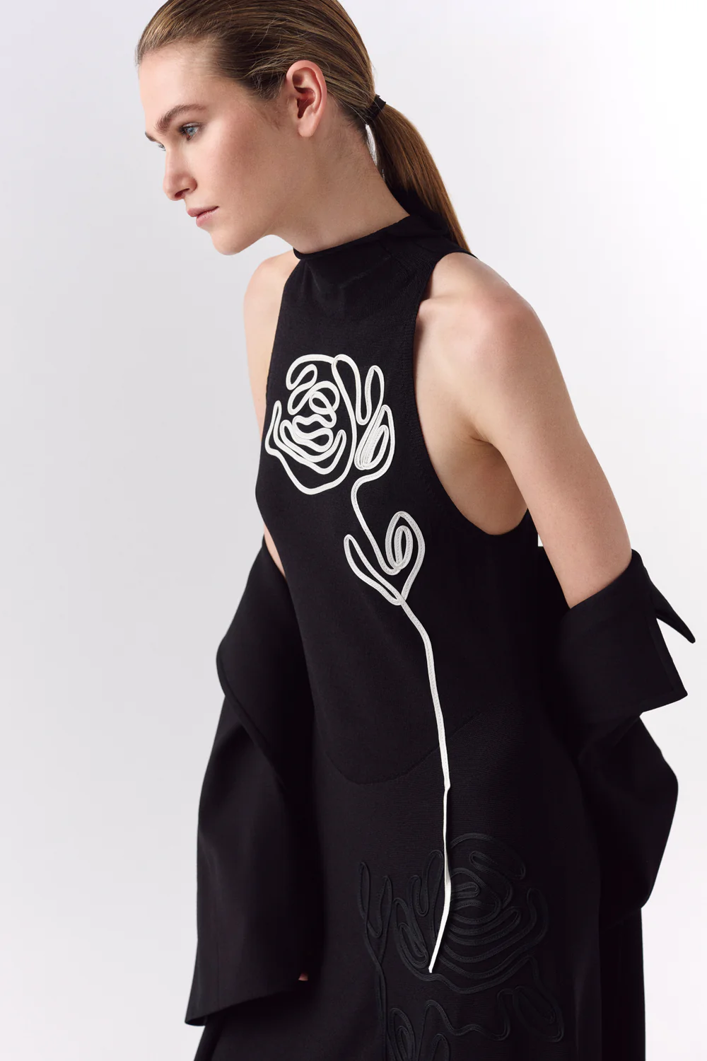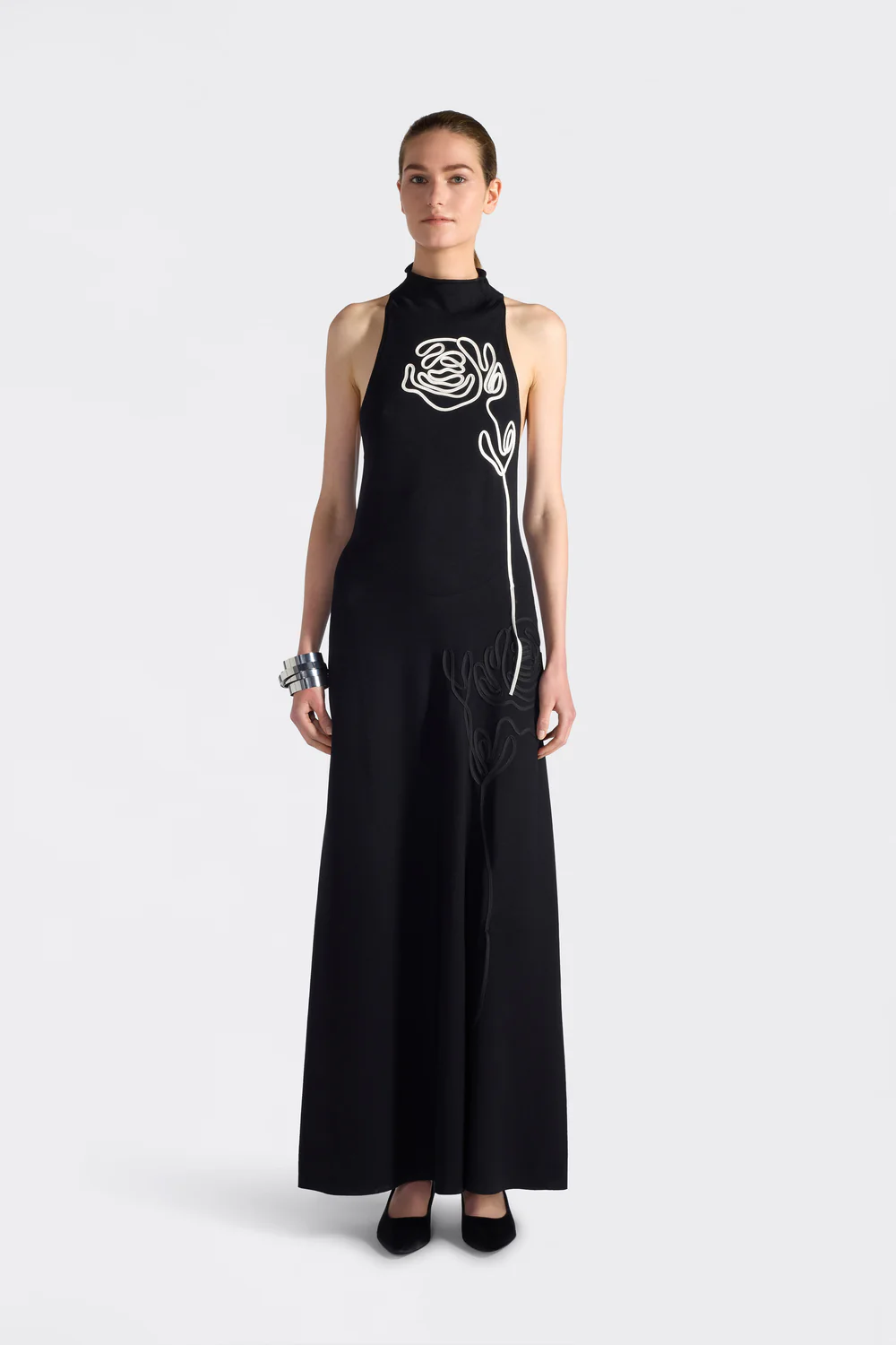 Long dress with halter neckline in stretch viscose, trim applications forming floral embroidery. Slightly a-line.