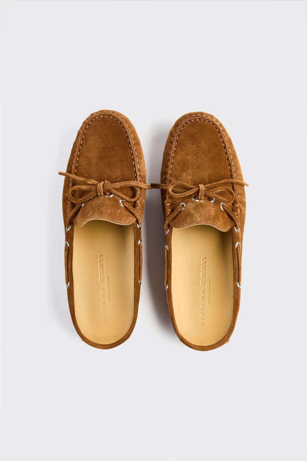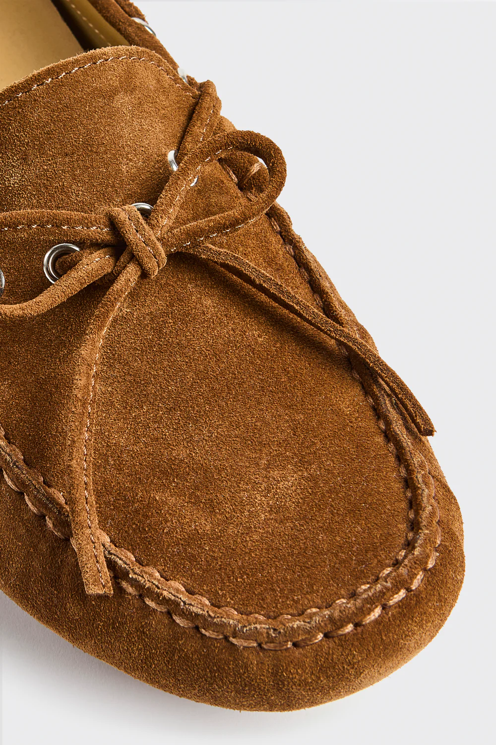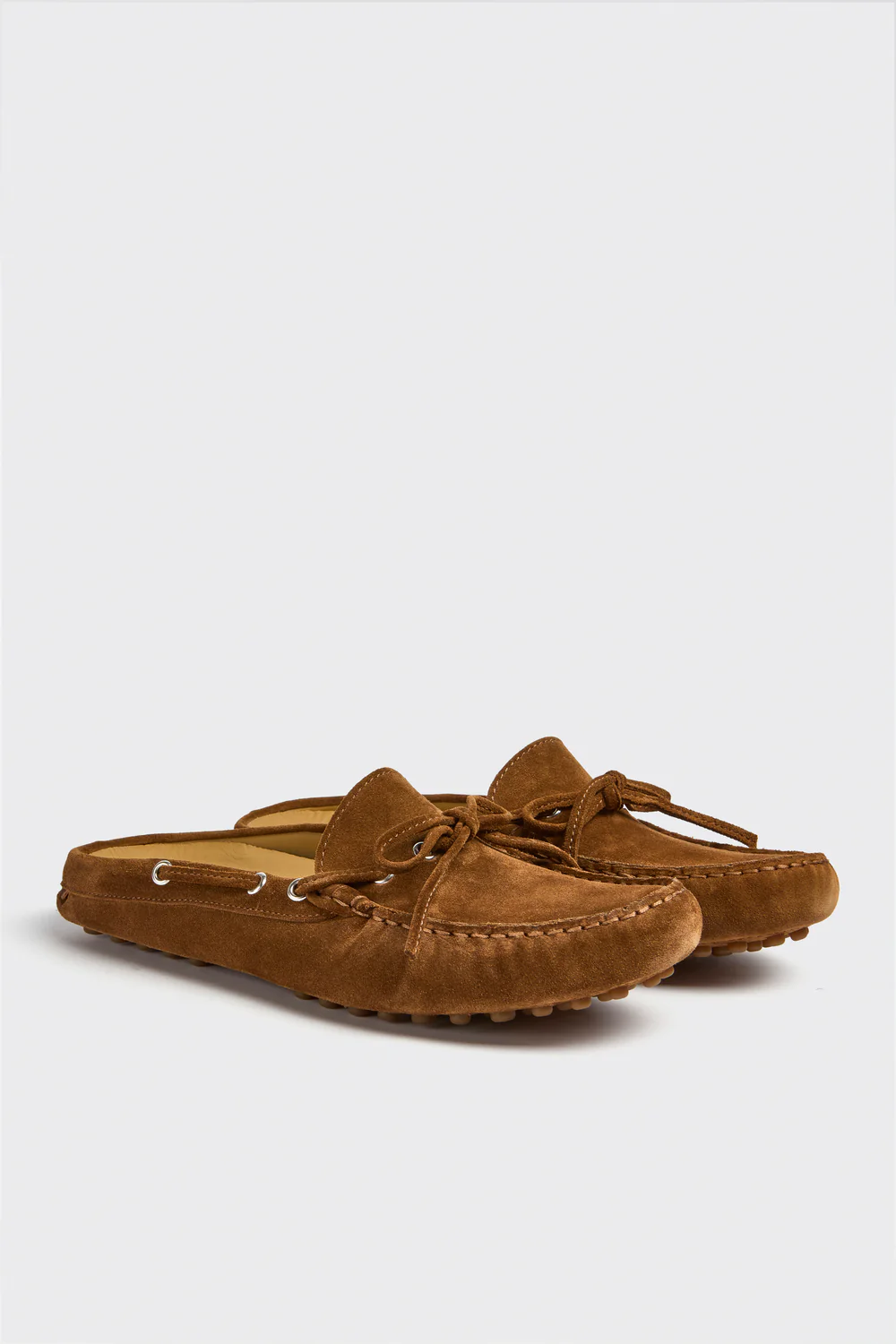 Bark-style slippers in suede calfskin with lace-up and metal eyelets, rubber driver sole.