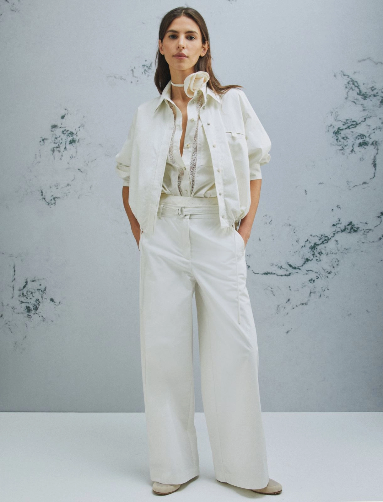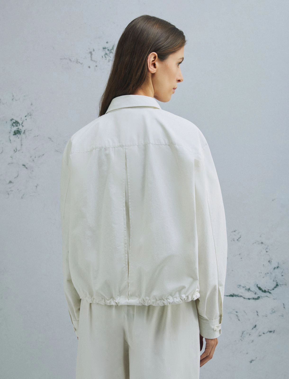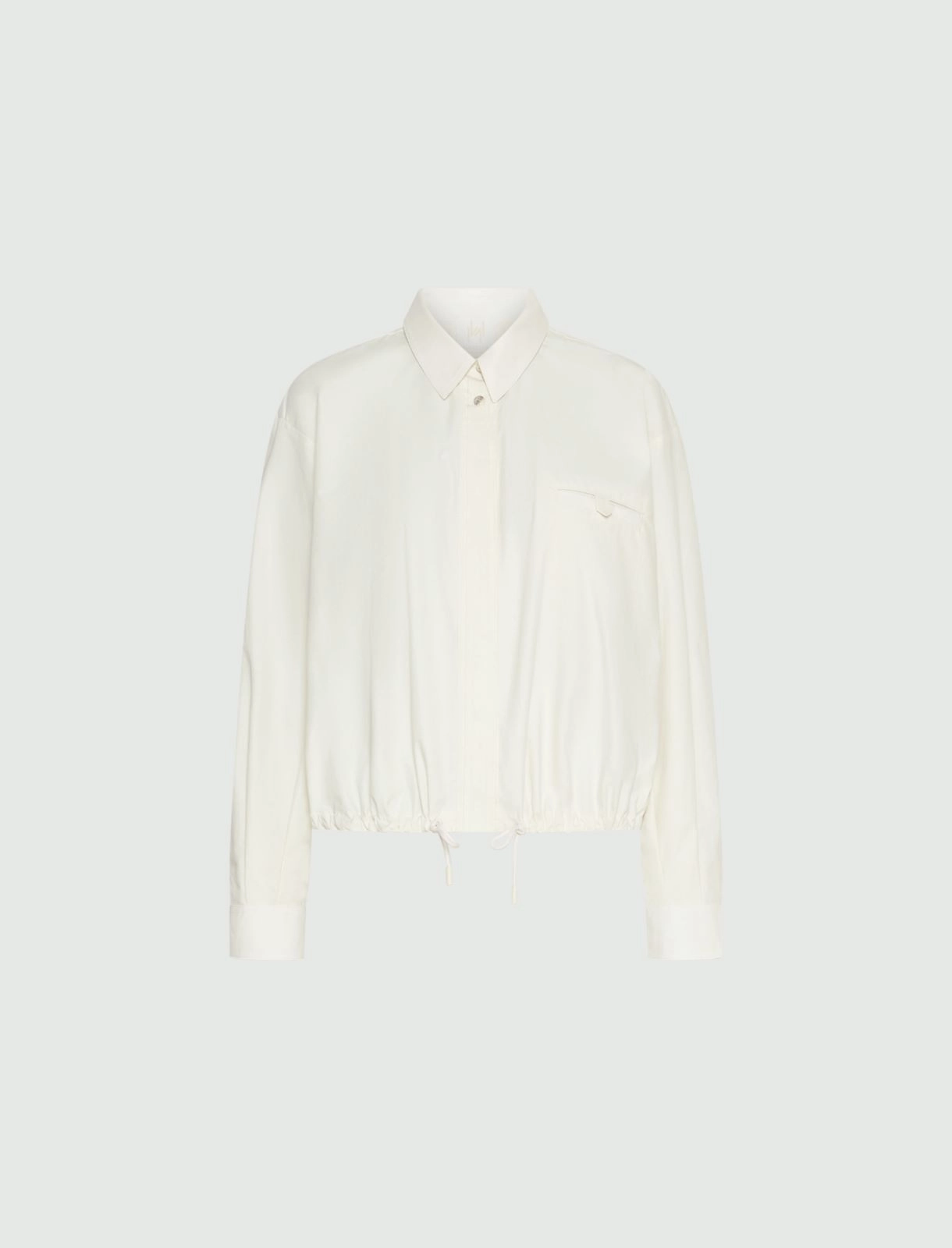 • Shirt collar, dropped shoulders and a fastening with only the top button visible