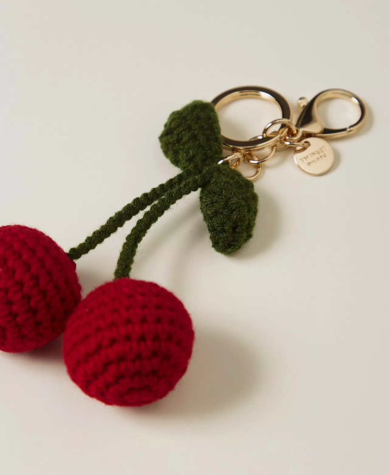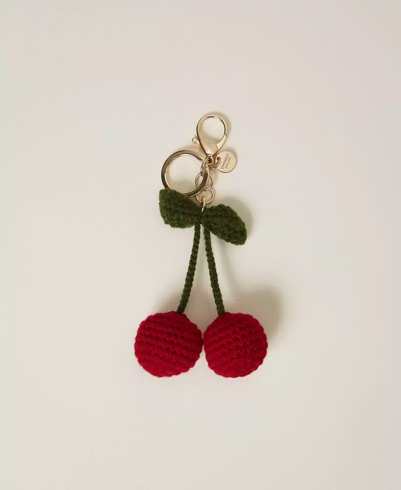 Key ring with hand-made crochet cotton cherries. Clasp and ring, round logo plate, gold-tone metal. Can be worn as charm to personalize bags.