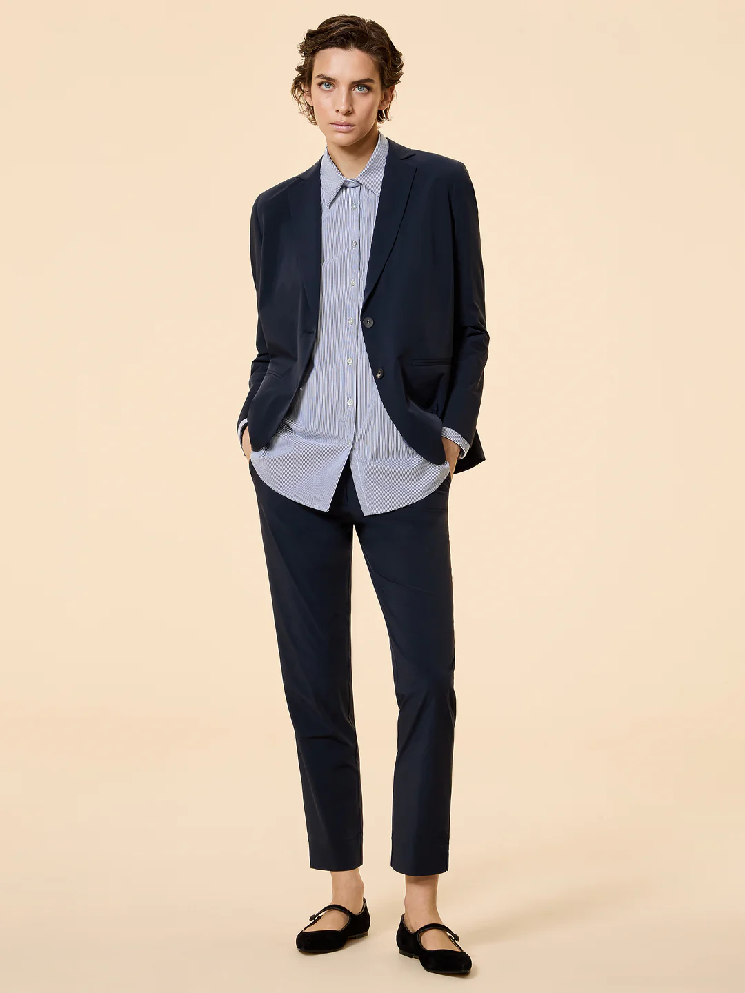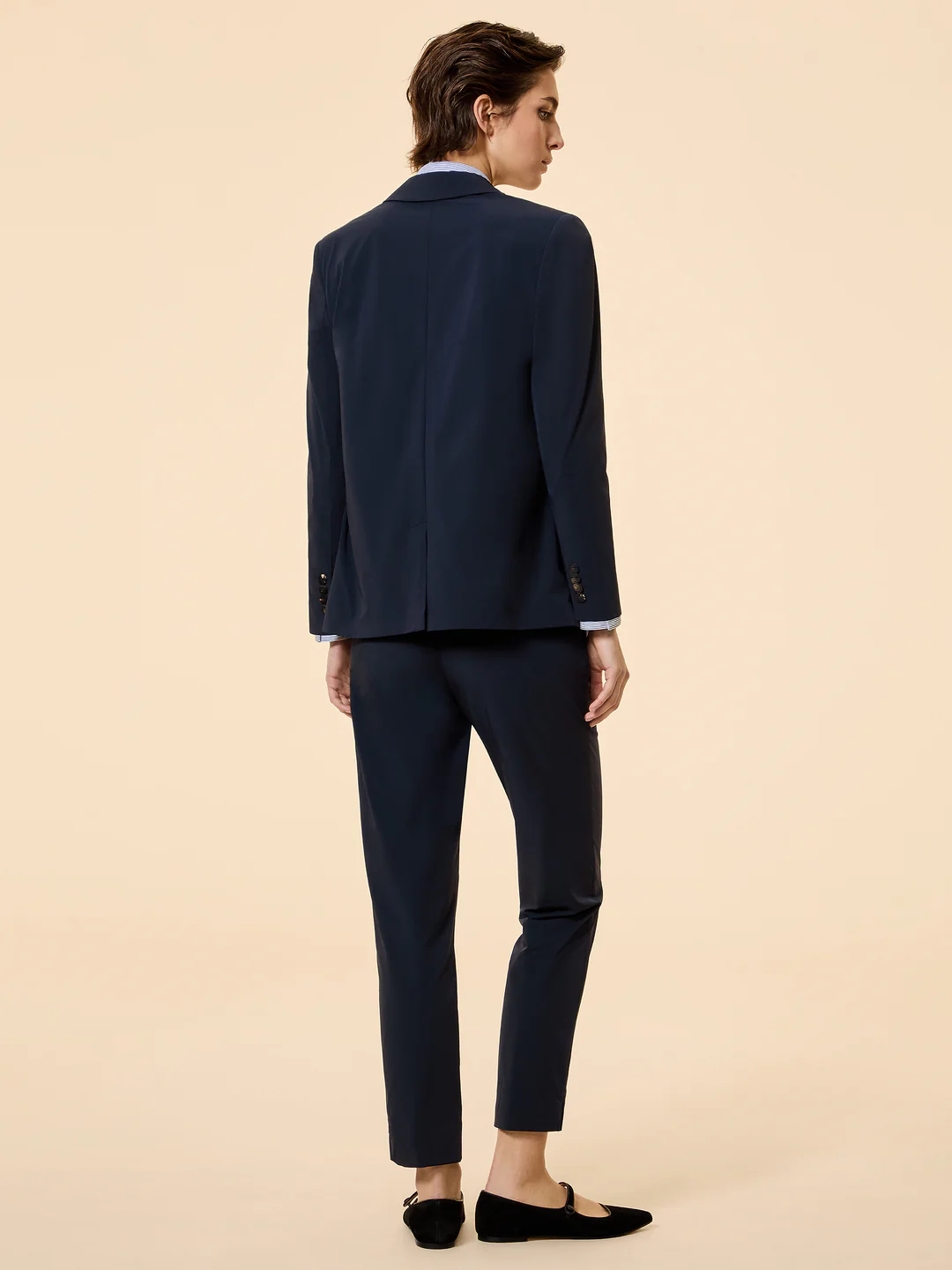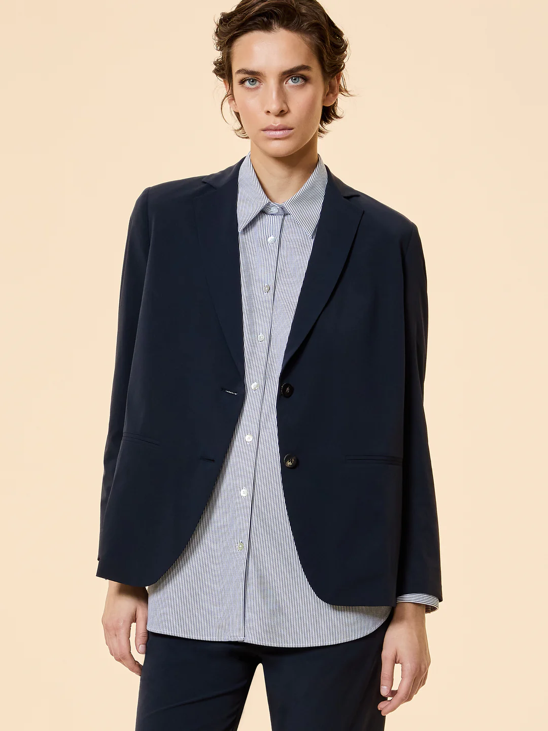 Classic lapels, a single-breasted closure with horn buttons, and welt pockets.