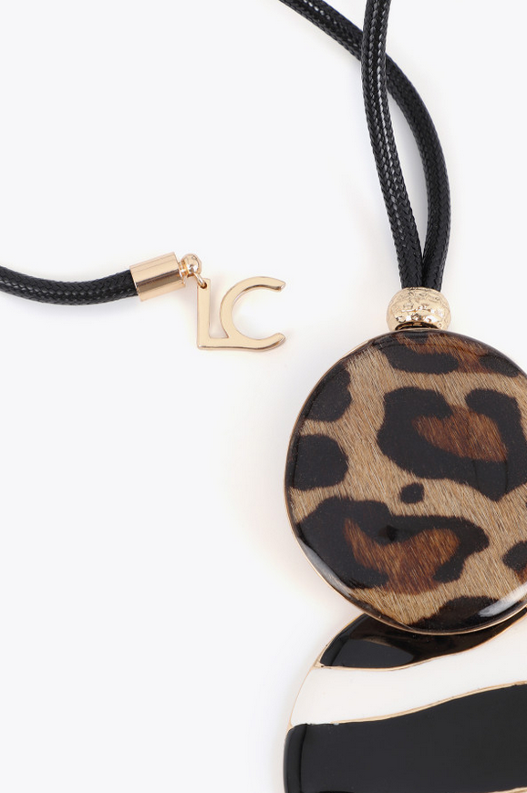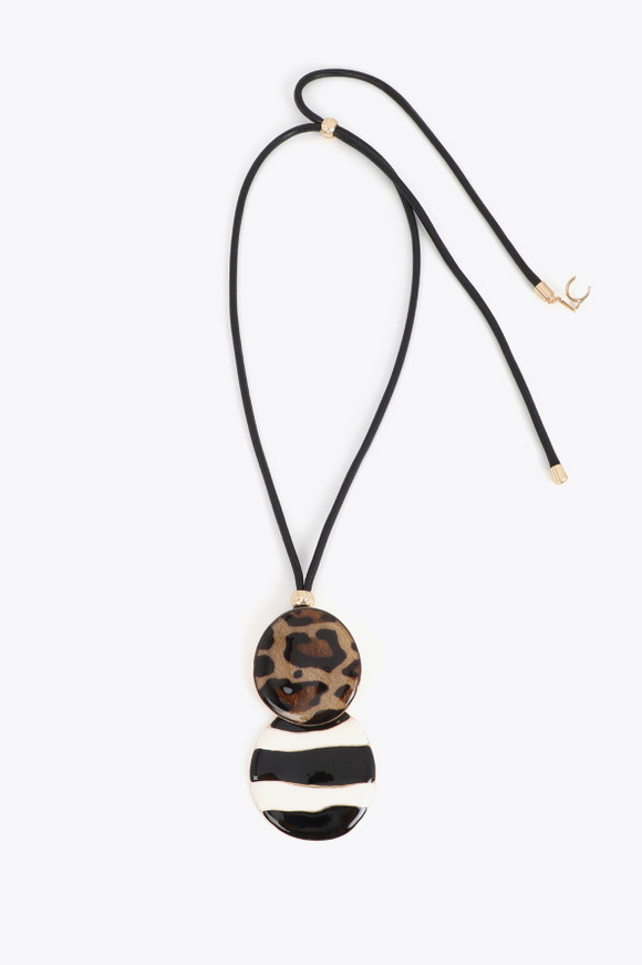 Long necklace featuring a stylish double pendant with animal print and stripes in neutral tones. Adjustable cord and golden logo detail on the clasp. Perfect for adding style to any daily look.