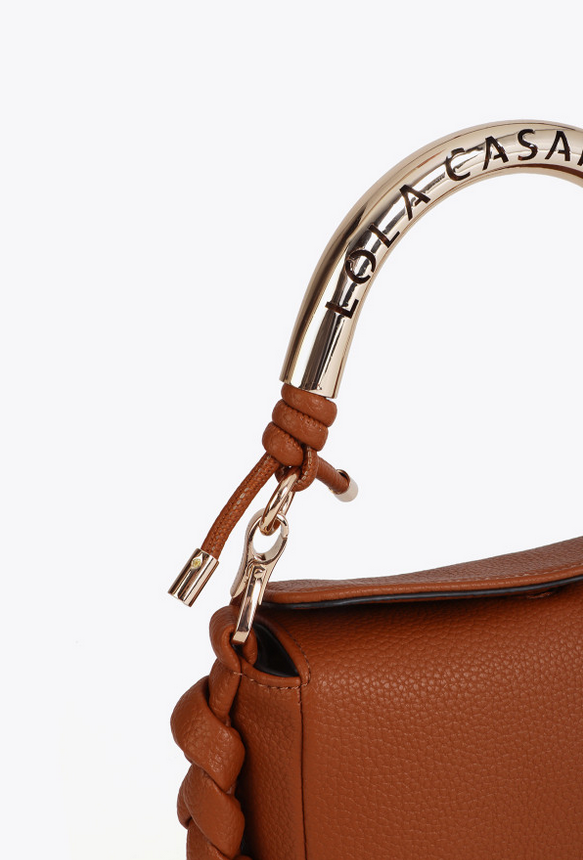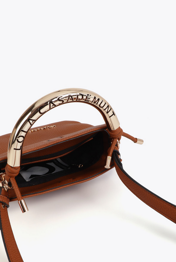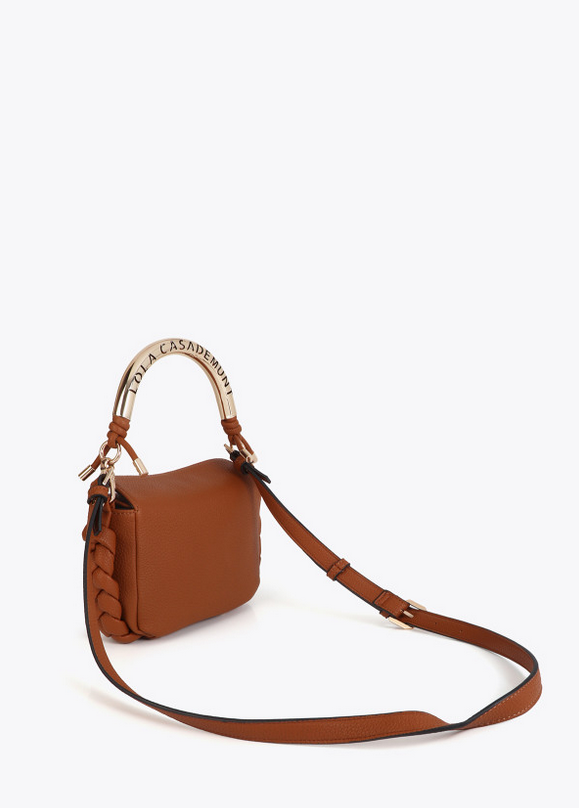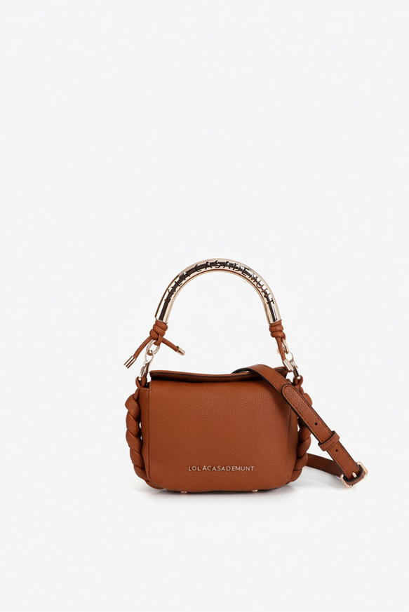 Mini crossbody bag in leather with cut-out metallic handle and side braiding. Features a secure magnetic closure and adjustable strap. Modern and chic for everyday use.