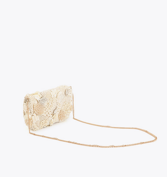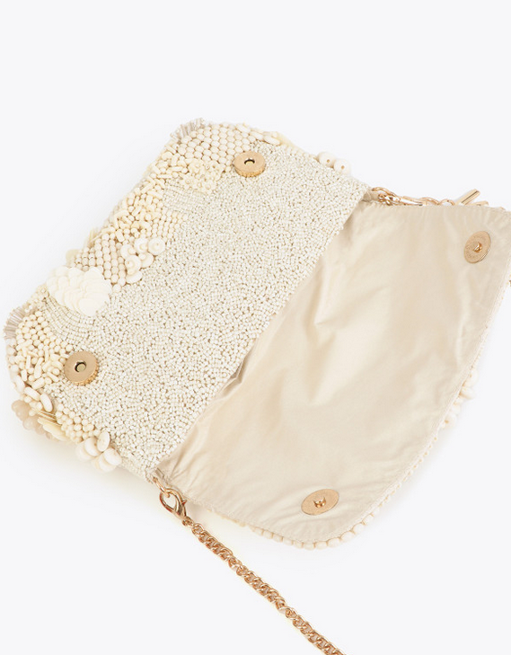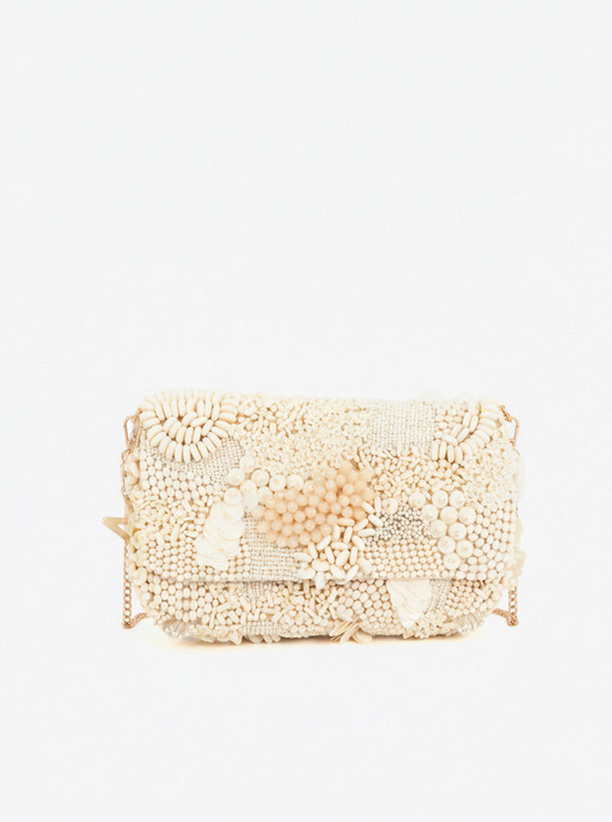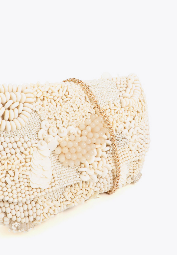 Baguette bag styled with tonal beads. Compact design with magnetic closure and removable gold chain. Perfect for carrying essentials stylishly.