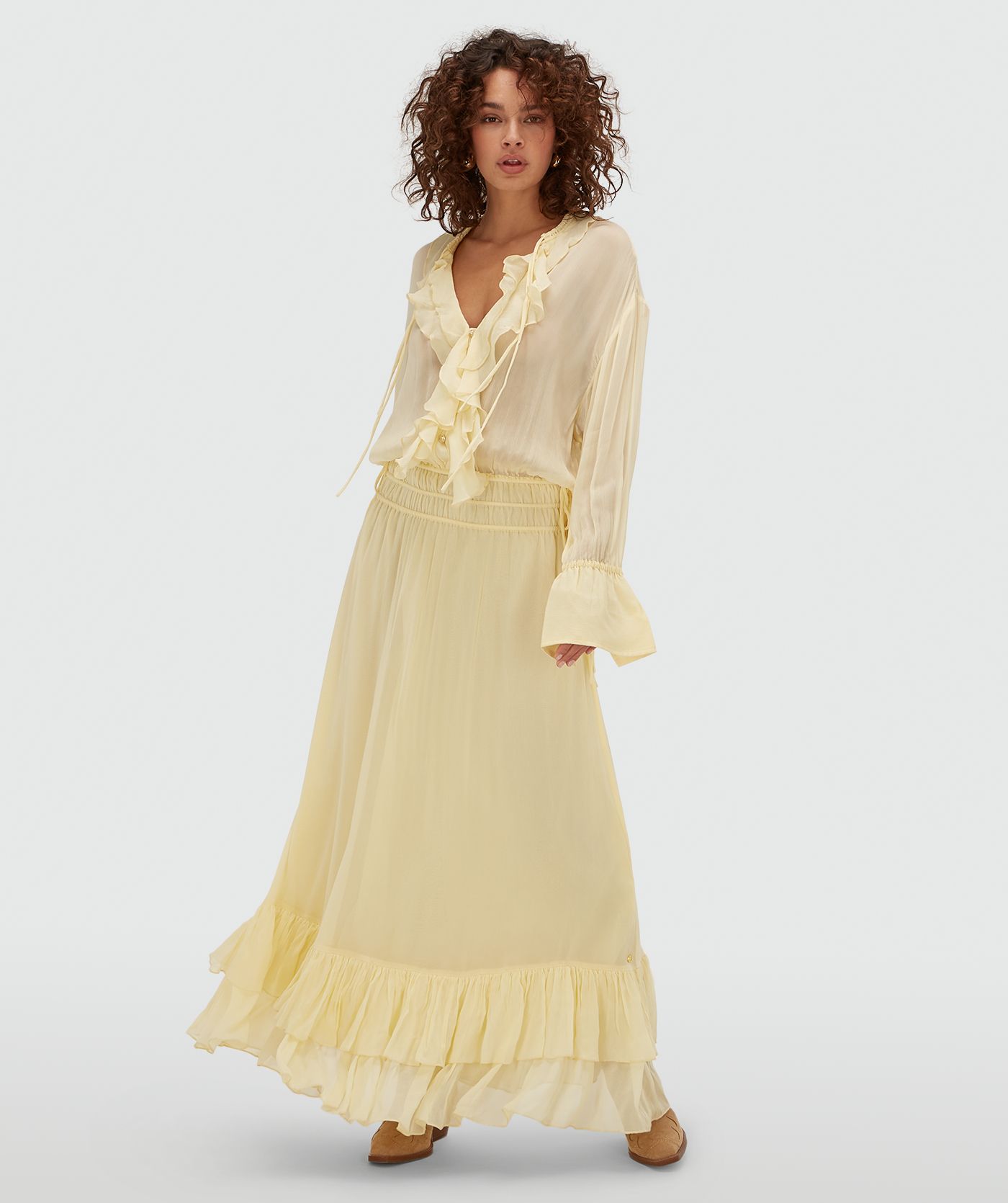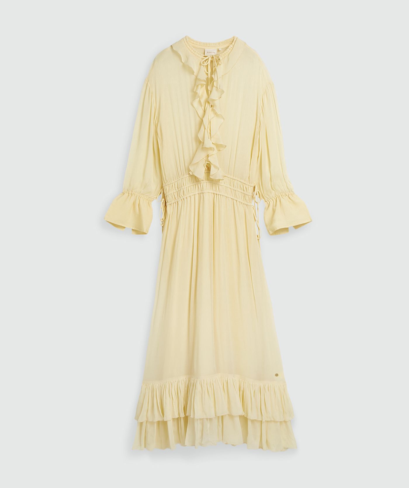 The long light yellow dress is made from chiffon with FSC-certified viscose. The skirt is lined to prevent sheerness. The tie straps at the waist allow you to create extra definition. The gold-colored branded buttons and ruffles complete the design.