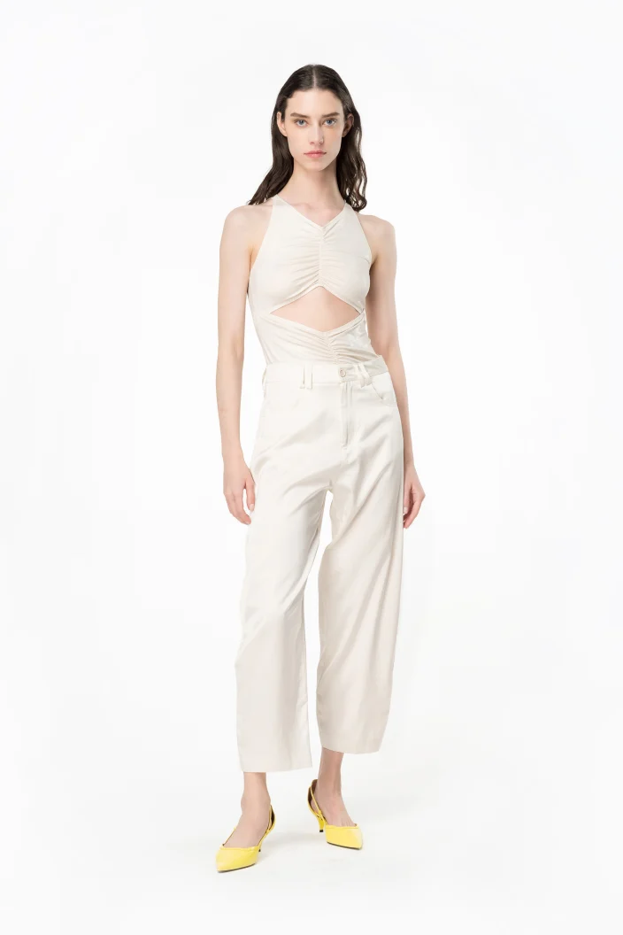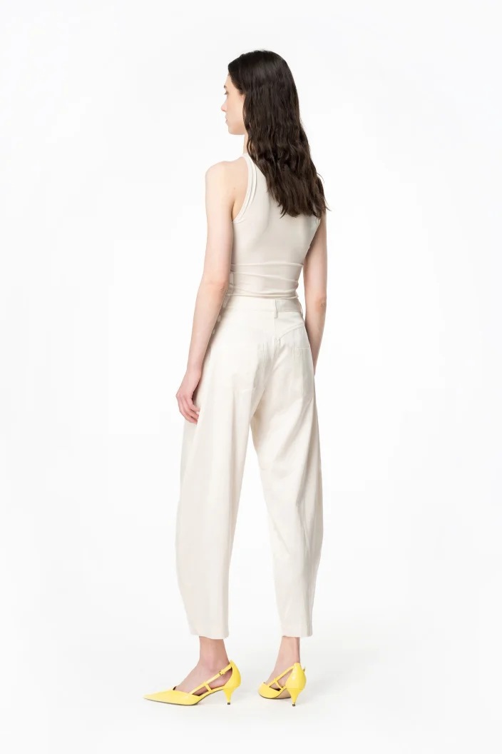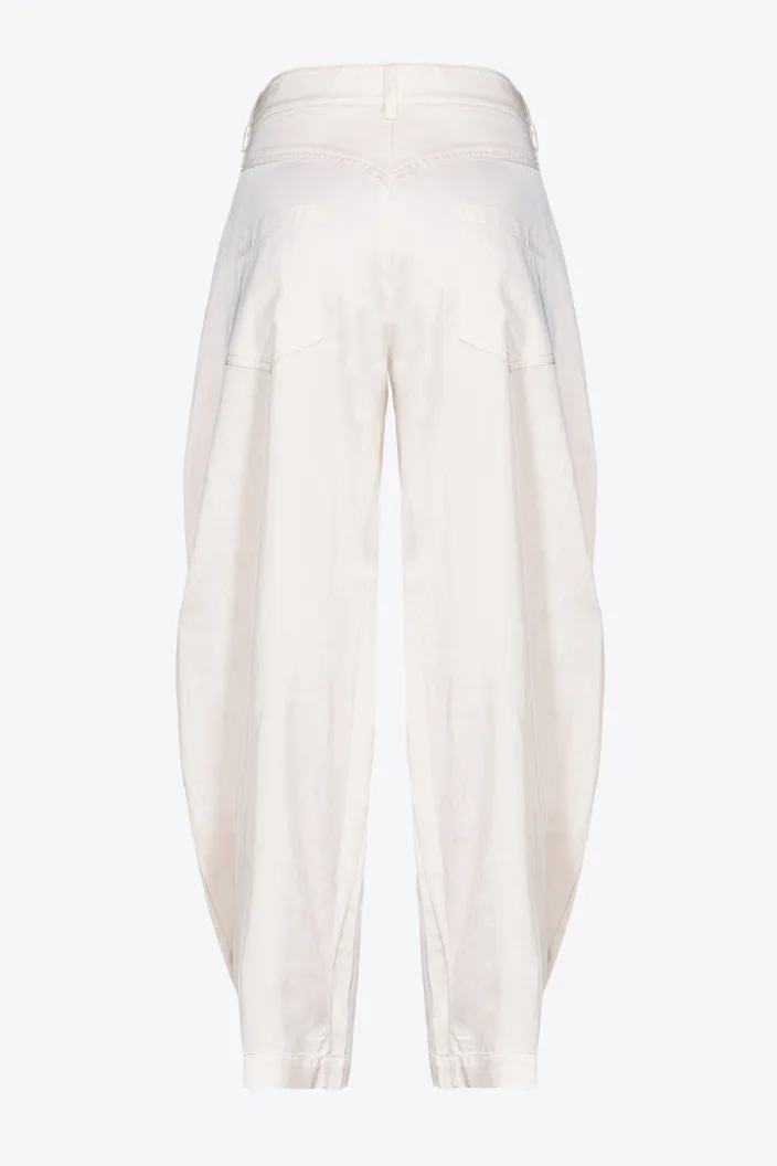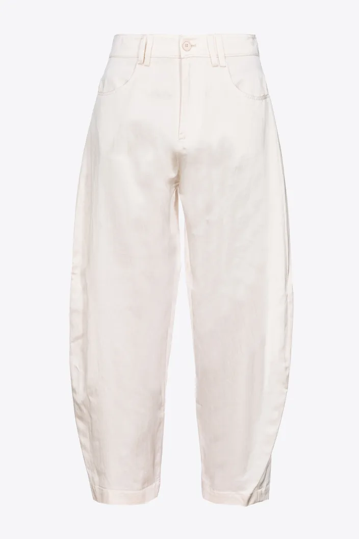Cotton and viscose satin barrel-leg trousers. High waist with belt loops, comfortable wide legs that are slightly tighter at the bottom, side pockets and patch pockets on the back. Matching-colour zip and button fastening.